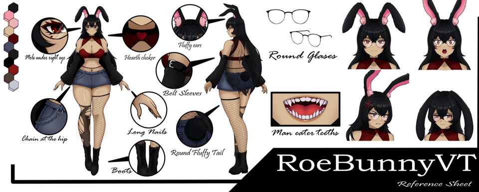 Main Points of design:- Curvy bunny girl with a cute-but-dangerous vibe- Brown/Grey skin tone, red eyes, and a small mole under her right eye- Long black hair with bangs, reaches past the waist- Large fluffy bunny ears (black outside, pink inside) + round cotton type fluffy tail- Glasses: thin black upper frame with clear lenses, rounded bottoms (soft oval/round shape), lightweight and modern — not thick or oversized- Sharp “man-eater” teeth visible when smiling or angry- Dark Red halter crop top connected to a heart choker- Black detached sleeves held up with silver belt straps- Denim short shorts, heart detail on the back, chain at the ride side of hip- Thigh high Fishnet stockings on left leg / Knee High Torn Stockings on right leg + black ankle boots- Long, naturally colored sharp nails- Expressions range from sweet and shy to intense / yandereKey details to never miss: mole under right eye, heart choker, glasses, fluffy ears & tail, sharp teeth.Main Points of design:- Curvy bunny girl with a cute-but-dangerous vibe- Brown/Grey skin tone, red eyes, and a small mole under her right eye- Long black hair with bangs, reaches past the waist- Large fluffy bunny ears (black outside, pink inside) + round cotton type fluffy tail- Glasses: thin black upper frame with clear lenses, rounded bottoms (soft oval/round shape), lightweight and modern — not thick or oversized- Sharp “man-eater” teeth visible when smiling or angry- Dark Red halter crop top connected to a heart choker- Black detached sleeves held up with silver belt straps- Denim short shorts, heart detail on the back, chain at the ride side of hip- Thigh high Fishnet stockings on left leg / Knee High Torn Stockings on right leg + black ankle boots- Long, naturally colored sharp nails- Expressions range from sweet and shy to intense / yandereKey details to never miss: mole under right eye, heart choker, glasses, fluffy ears & tail, sharp teeth.